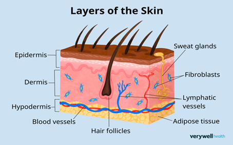 The loose connective tissue that lies beneath the dermis is called the hypodermis or subcutis. This layer, which mostly contains adipocytes, helps to store fat, regulate body temperature in cold weather, and act as a cushion against external shocks. It may include sensory pressure organs and acts as a conduit for principal blood vessels and nerves to reach the skin. In addition, the dermis and epidermis are supported by the hypodermis, or subcutaneous fat tissue. (4)