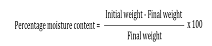 Prepared films are weighed individually and kept in desiccators containing calcium chloride at room temperature for 24 h. The films are weighed again after a specified interval until they show a constant weight. Percentage moisture content is calculated using following formula.