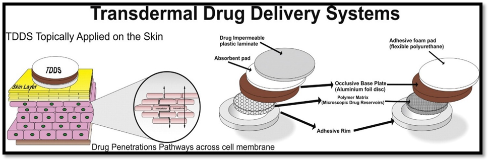 Patches, another name for transdermal drug delivery systems (TDDS), are dosage forms intended to apply a therapeutically effective quantity of medication to a patient's skin. It is necessary to consider the entire morphological, biophysical, and physicochemical characteristics of the human skin to administer medicinal substances through it for systemic effects. By improving patient compliance and preventing first-pass metabolism, transdermal administration offers a significant advantage over injectables and oral methods.(2)