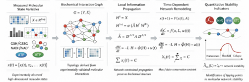 Figure 12.1 Graph-theoretic and dynamical systems framework formalizing redox–bioenergetic network propagation, exposure-driven state evolution, and stability thresholds governing transition from molecular homeostasis to pathological collapse.
