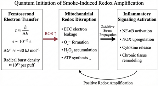 Figure 3.3.1 Femtosecond-scale electron transfer (τ ~ 10?¹? s) generates a high radical flux (~10¹? per puff; ΔG° ≈ −30 kJ mol?¹), inducing mitochondrial ETC leakage, ROS amplification, ATP decline, and sustained inflammatory signaling via a positive redox feedback loop.