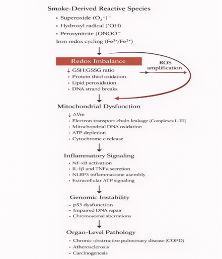 Figure 6.1.1 | Smoke-induced reactive species drive redox imbalance, mitochondrial dysfunction, inflammatory amplification and genomic instability, culminating in organ-level pathology.