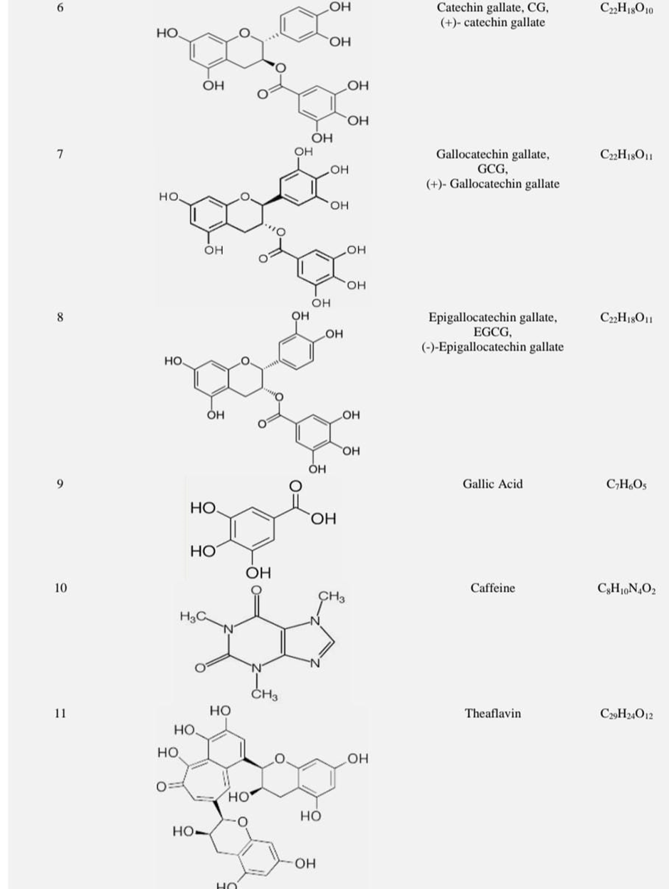 Poly phenols like catechins with epigallocatechins -3-gallet being the most abundant and studied .Other notable componds include caffeine, theanine, chlorophyll, vitamins ,and minerals. These compounds contribute to green tea’s various health benefits including anti-oxidant, anti-inflammatory and potential anti-cancer properties. The catechins, particularly epigallocatechin’s -3-gallate .These polyphenols along with other flavanols, flavanonols and phenolic acid, contribute to the overall anti-oxidant capacity of green tea.