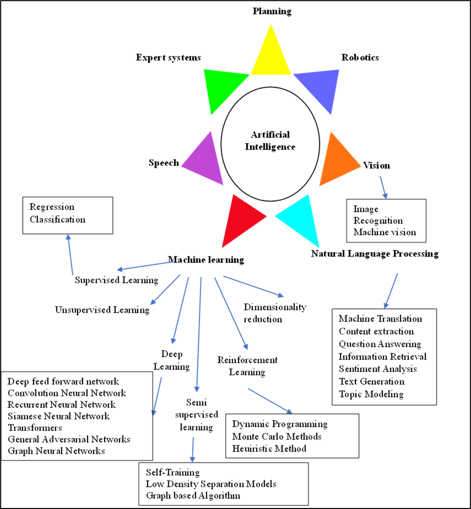 Artificial Intelligence (AI) is a branch of science focused on the development of intelligent systems, particularly computer programs, designed to emulate human cognitive processes and decision-making. It aims to deliver outcomes that closely resemble human attention and reasoning. (1) (2) AI has numerous applications in the pharmaceutical field, including developing treatments for complex and rare diseases like Alzheimer’s and Parkinson’s. It enhances drug adherence and dosage optimization, improves data analytics, accelerates the identification of suitable patients for clinical trials, introduces automated robotic pharmacies for prescription fulfilment and dispensing, and streamlines marketing, logistics, and supply chain management.(3) Figure no: 1 is a mind map summarizing the key components and subfields of Artificial Intelligence (AI). It organizes the relationships and methodologies within AI, focusing on its primary areas of application and study.(4) The main branches of Artificial Intelligence are as, Machine Learning (ML), Planning, Deep Learning (DL), Robotics, Natural Language Processing, Expert Systems, Speech, Vision, etc. and the deep knowledge about these branches is given in figure no. 1