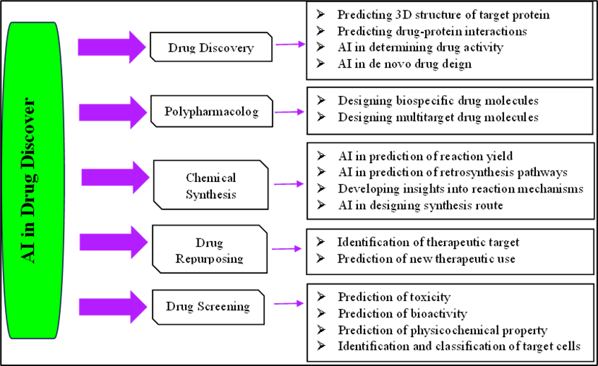Developing new drugs is a complex, costly, and time-intensive process, typically taking 10–15 years. Despite substantial financial investments by the pharmaceutical industry, the pursuit of groundbreaking drugs remains challenging. Only one out of ten potential drug candidates successfully pass phase I clinical trials and gains regulatory approval. AI used in different steps of drug discovery as drug design, chemical synthesis, poly-pharmacology, drug screening, and repurposing. (7) Figure no. 3 illustrates the diverse applications of Artificial Intelligence (AI) within the drug discovery process. The drug discovery pipeline is categorized into five primary domains where AI significantly contributes:(8) AI is transforming drug discovery and development by enhancing research capabilities and outperforming traditional methods in areas like drug-target modeling and repositioning. In Drug Repositioning, AI speeds up finding new uses for existing drugs, reducing costs and time. AI was pivotal during COVID-19 in assessing antiviral drugs. While in Genomics, AI and ML applications in genomics improve drug development, emphasizing the need for integrated data systems. In Advanced Modeling, Techniques like hypergraph neural networks and bond-to-bond propensity help improve predictions and identify allosteric modulators for safer drugs.