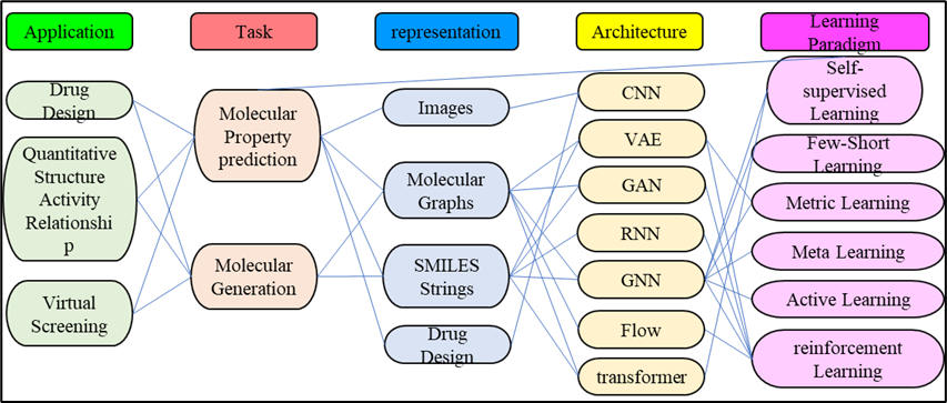 Small molecules can be represented in multiple ways, including fixed fingerprints, molecular graphs, SMILES strings, and visual formats like images. AI techniques, such as convolutional neural networks (CNNs), recurrent neural networks (RNNs), graph neural networks (GNNs), variational autoencoders (VAEs), generative adversarial networks (GANs), normalizing flow models, and transformers, are applied to these representations. Despite these advancements, challenges remain, such as the scarcity of labeled data for molecular property prediction and the complexity involved in generating molecules with specific properties. To address these issues, various learning paradigms have been developed. These include self-supervised learning for utilizing unlabeled data, reinforcement learning to optimize chemical space exploration, and methods like few-shot learning, metric learning, meta-learning, and active learning to improve model performance and adaptability. These innovations are instrumental in enhancing AI's ability to navigate chemical space, thereby expediting drug discovery and the development of new treatments.(10) Figure no:4 shows details about the applications of AI in small-molecule drug discovery.