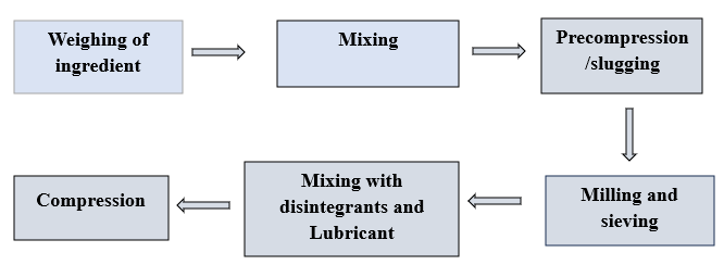 1. Dry granulation: This is a new method for semi-automatic production of granules. This method is applicable to all fixed-dose drugs. Dry granulation, also known as pre-compression or double-compression, is a size-en larging process that has been considered to improve the flow and compression properties of powders that are not suitable for compression. In this process the powder mixture is compacted by applying force. This generally increases the size significantly. Dry granulation is typically used to produce tablets where formulation ingredients are prone to flow problems. Manu facture of tablets by the dry granulation process eliminates many unit operations, but includes milling, weighing, mixing, beating, dry sieving, lubricating, and compressing granules into tablets. Dry granulation refers to the process of granulating without the use of liquids. Forming granules using the dry granulation process is generally accomplished by either impact techniques or roller compaction. Slugging involves compacting primary powder particles into large flat pallets using a tablet press, or more commonly a large, heavy-duty rotary press. The resulting compact is then ground using conventional grinding equipment. The ground slag was then passed through a screen of desired mesh size for sizing. After adding lubricant granules, it is finally compressed into tablets. Roller compaction is a relatively simple, efficient and inexpensive form of dry granulation. In this process, the compounding ingredients are passed between two counter-rotating rollers where they are compressed and bonded into a layer of solid mass. The compact is then further ground, sorted, lubricated and compressed into tablets (Figure 1) . Various steps in volved in dry granulation. These are: