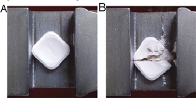 Figure 2: Tablet configuration for breaking force measurement, (A): Tablet before applying the pressure; (B): Tablet after the test (Agar wal SP and Khanna R, 2000)