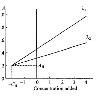 The analyte concentration can be calculated at the capture attempt point, known as the H Point. The esteem gotten after each expansion will be only connected to the analyte concentration since the absorbance of the interferent will be the same at the two wavelengths. In these strategy explanatory signals gotten at two wavelengths where the absorbance is the same for the interferent and diverse for the analyte; the application of the guideline of standard addition method, beneath these conditions hence leads to two straight lines at each wavelength which caught at a point called H-point, characterized by the arranges (-??, ??).