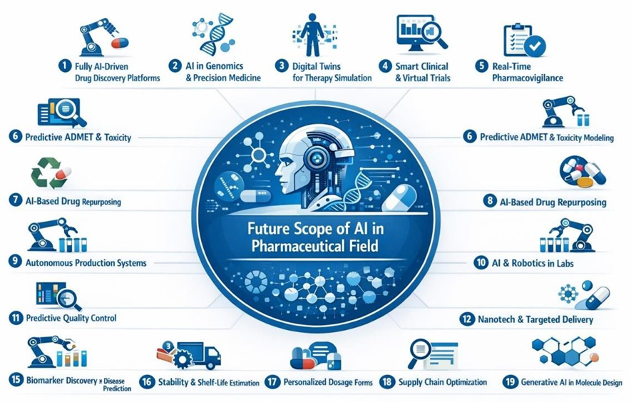 Although challenges such as data privacy, algorithmic bias, and regulatory limitations still exist, ongoing advancements in machine learning, deep learning, and big data analytics continue to strengthen AI’s role. With continuous improvements, AI will pave the way for personalized medicine, autonomous laboratories, and highly efficient pharmaceutical systems. Overall, AI holds immense potential to revolutionize the pharmaceutical industry, making drug development more precise, faster, and more cost-effective than ever before.