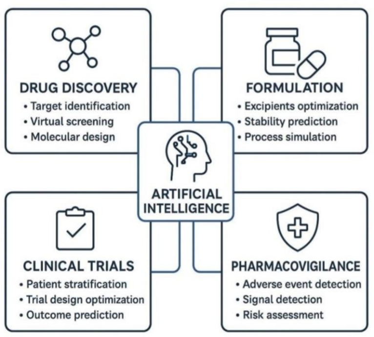 Beyond discovery, AI also plays an important role in pharmaceutical formulation and manufacturing. In formulation development, AI supports rational excipient selection, stability prediction, and optimization of formulation variables under Quality by Design (Qbd) principles. During manufacturing, AI-driven systems enable real-time process monitoring, predictive maintenance, and process optimization, contributing to the implementation of Industry 4.0 concepts in pharmaceutical production.