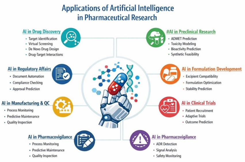 Artificial intelligence is transforming pharmaceutical research by enabling faster, smarter, and more accurate scientific decision-making across the entire drug development pipeline. From target identification and virtual screening to formulation design, clinical trials, and pharmacovigilance, AI significantly reduces time, cost, and failure rates. Its ability to analyze large datasets, predict outcomes, and automate complex processes has made it an essential tool for modern drug discovery and development.