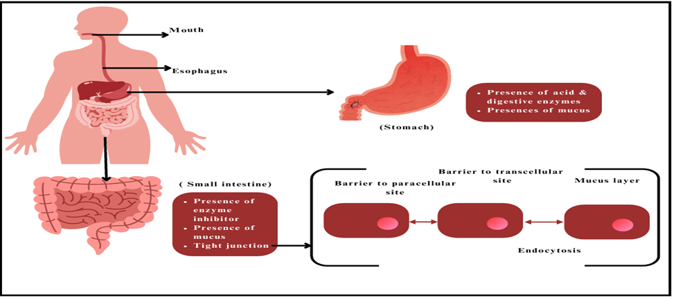 GIT causes a series of obstacles to oral insulin absorption, mainly enzymatic, physical, and chemical. Oral medications pass through the GIT. Sticks to the mucus layer, passes through the intestinal epithelium and then enters the blood. However, due to its instability in the gastrointestinal tract and limited epithelial penetration, insulin has very low oral bioavailability (less than 1%). [19]