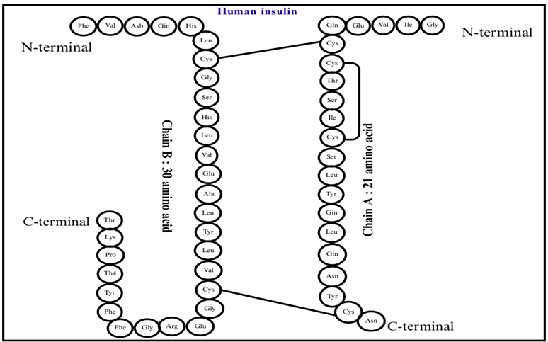 Structure: Comprised of two peptide chains, A and B, linked by disulphide bonds, insulin has a tertiary structure essential for its biological function. The A chain contains 21 amino acids, while the B chain consists of 30 amino acids.
