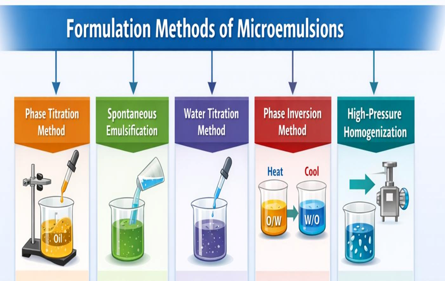 Although microemulsions are thermodynamically stable and do not require high energy, high-pressure homogenization may be used in some cases to ensure uniformity during large-scale production. This method is applied cautiously, as excessive energy is not essential for microemulsion formation.[17.18]