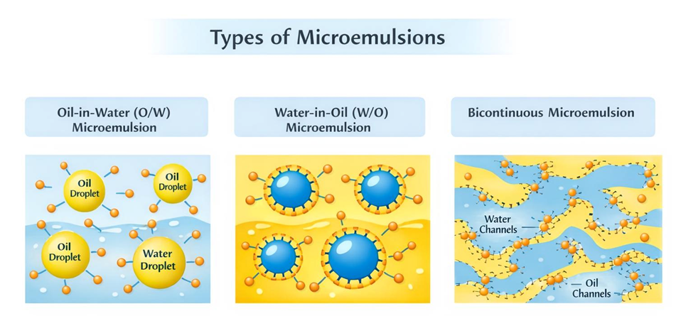 Microemulsions are classified based on the internal structure and distribution of oil and aqueous phases. The type of microemulsion formed depends on the composition of oil, water, surfactant, and cosurfactant, as well as their relative proportions. The three main types of microemulsions are oil-in-water (O/W), water-in-oil (W/O), and bicontinuous microemulsions.[6]