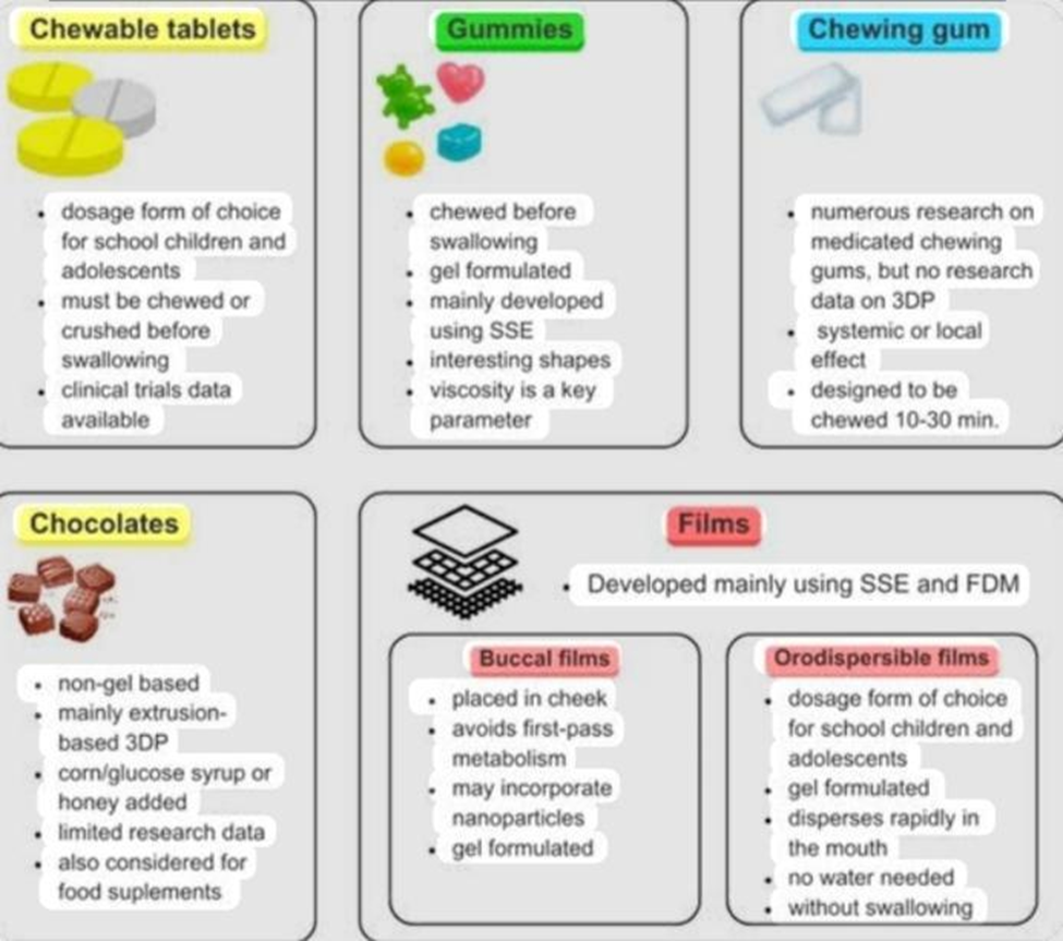 About 654,028,000 children under the age of five [26] Within this pediatric community, we can identify numerous groups based on their age in completed days [27], months, or years. The pharmaceutical industry must, with a Paediatric Investigation Plan (EU), involve youngsters in the drug development process.Or Paediatric Study Plan (USA). Additionally, numerous regulations have been put into place, including Title V of the Food and Drug Administration, which is part of the United States of America, FDASIA [28], which reauthorizes and modifies aspects of the Best Pharmaceuticals for Children Act (BPCA) and the Paediatric Research Equity Act (PREA). In a similar vein, the European Union established the EU Paediatric Regulation: The World Health Organization, along with (EC) Nos. 1901/2006 and (EC) No. 1902/2006 [29], launched the Make Medicines Child Size campaign [30] At the same time, a number of projects, such as the European Paediatric Formulation Initiative (EuPFI; 2007) and the Global Paediatric Formulations Accelerator (GAP-f) [31], are examples of this. These prioritize creating age-appropriate drug formulations. Additionally, several groups held seminars, including the workshop on the challenges of pediatric formulation development. The 6th APV Winter Conference on Patient-Centric Drug Development and Today and Tomorrow's Strategies in Product Development [32], which addresses the challenge of creating formulations specifically designed for children. Chewable pills and orally disintegrating dosage forms are thought to be the preferred dosage forms for school-age children (6-11 years) and teenagers. These include: