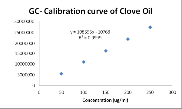 The Standard Calibration Curve was constructed by plotting concentration of Clove Oil Vs. peak area of Clove Oil. The calibration curve was constructed to determine the % drug release from the equation y = mx + c.