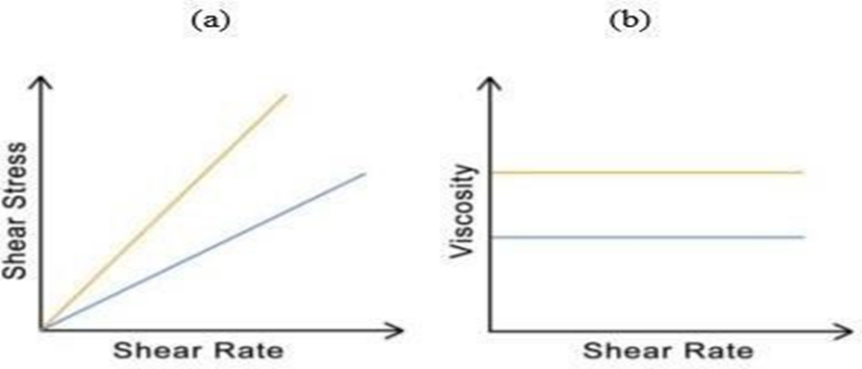 A plot of shear stress versus shear rate with a straight line passing through the origin is obtained. This represents the flow curve or rheogram for a Newtonian system is seen in Figure a. The viscosity curve is another plot of viscosity versus shear rate which can characterize a Newtonian system. Viscosity curves show a straight line at a constant value equal to η, which is seen in Figure b. The most common examples of Newtonian fluids are water, mineral oil, vegetable oil, whole milk, pure sucrosesolutions, shampoos and liquid soap