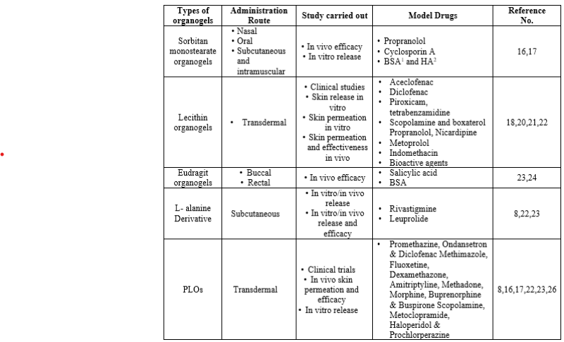 Organogels, whether nonpolar (organogels) or polar (hydrogels), provide a variety of three-dimensional connections with applications ranging from drug delivery to cosmetics. Organogels, especially those produced by two systems of gelling agents and nonpolar solvents, have special properties such as thermal reversibility, viscoelasticity, and ease of customization. These properties make them attractive for drug formulations, extending shelf life and increasing drug delivery. Various organogelators, including sterols, sorbitan monostearate, lecithin, and anthraquinone derivatives, contribute to this difference. Special types, such as lecithin organogels, Pluronic lecithin organogels (PLO), sorbitan monostearate organogels, and Eudragit organogels, have unique physicochemical properties that expand their use in drug delivery and cosmetic applications. New organogel preparation methods, such as microwave heating and liquid fiber, are being developed that offer better options and save time. Meanwhile, various organogelators, from arylcyclohexanol derivatives to polymeric organogelators, expand the tools for the production of gels with good properties. Organogels are widely used in drug release control, oil recovery and many other applications. Ongoing research into supramolecular organogels and their adaptability combined with advanced preparation techniques make them key players in future advances in medicine and materials science. Overall, extensive research on organogels demonstrates their importance in problem solving and offers opportunities in many fields.