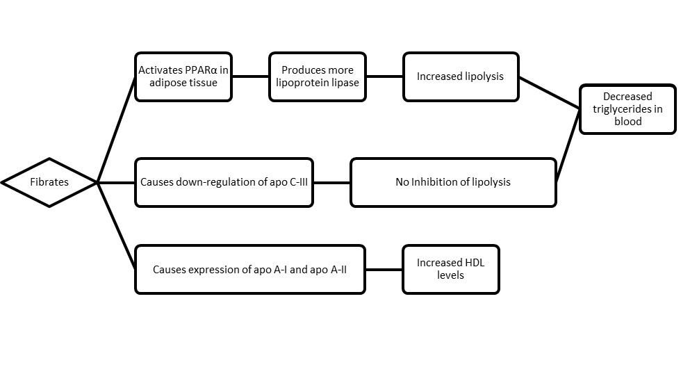 Fibrates exhibit their action via limiting the substrate available for synthesis of triglycerides in the liver and also induces an enzyme that leads to decreased triglyceride production. They modulate the LDL receptor-ligand interaction and cause the stimulation of a mechanism known as reverse cholesterol transport. This combined action leads to increased LDL clearance which further leads to a decreased level of LDL that can be oxidized.10