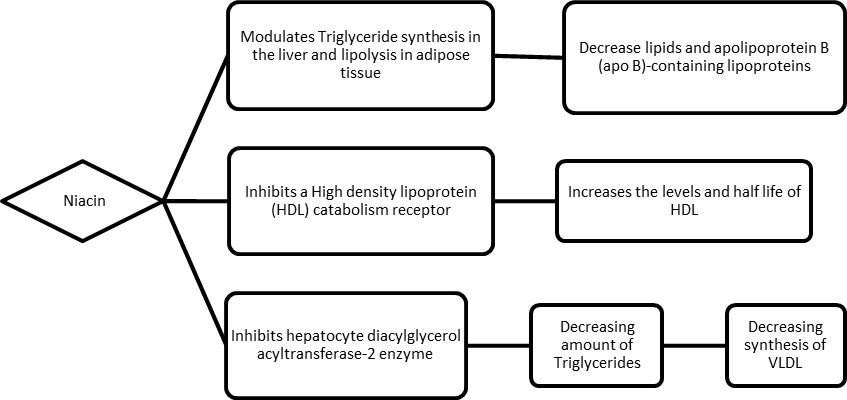 Nicotinic acid (as niacin) works by decreasing lipids and lipoproteins that contain apolipoprotein B (apo-B) via the alteration of synthesis of triglycerides in the liver or by altering lipolysis that occurs in the adipose tissues. It also inhibits an enzyme playing a vital role in the final step of triglyceride synthesis, thereby decreasing the amount of triglycerides. This also leads to a decreased availability of VLDL. Niacin increases the levels of HDL in the blood by preventing it’s catabolism via inhibition of the receptor.12