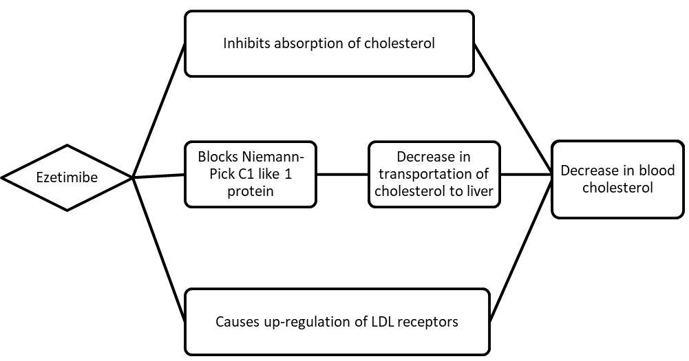 Cholesterol Absorption Inhibitor inhibits a transporter involved in the GIT which facilitates the cholesterol absorption, which therefore lowers the amount of cholesterol being absorbed into the body. This initiates a cascade of reactions in the liver finally leading to up-regulation of LDL receptors. This up-regulation leads to an increased LDL uptake into cells and therefore decreases the amount present in the blood.11