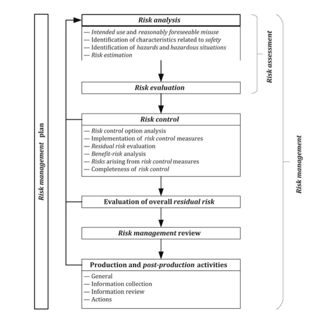 According to ISO 14971 (Risk Management of Medical Devices), the process should include the following steps:
