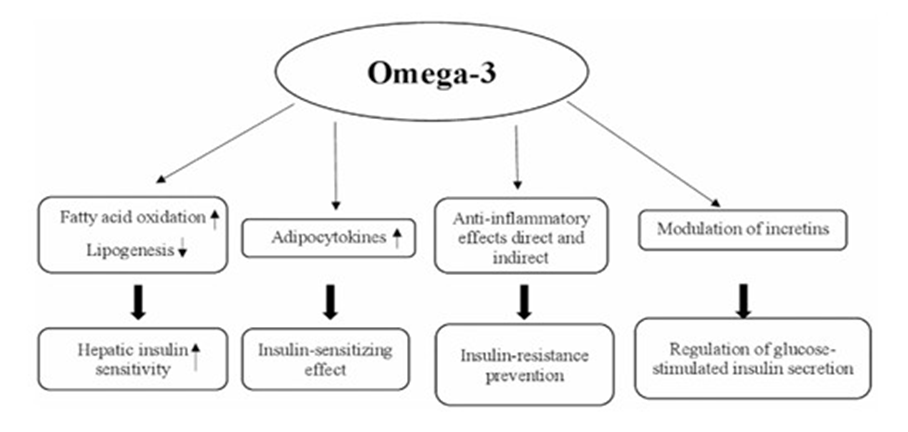 In Patients With Diabetes, Omega-3 Fatty Acids Are Recommended To Enhance Glucose Tolerance And Increase Insulin Sensitivity. Insulin Is Necessary For The Production Of Long-Chain N-3 Fatty Acids, Which Include Ethyl Esters That May Offer Potential Benefits For Diabetic Individuals. A High Intake Of Isoflavones (20-100 Mg/Day) Is Linked To A Reduced Incidence And Mortality Rate Of Type 2 Diabetes, Cardiovascular Diseases, Osteoporosis, And Certain Types Of Cancer. Docosahexaenoic Acid Plays A Role In Modulating Insulin Resistance, Which Is Particularly Significant For Women Experiencing Gestational Diabetes Mellitus, Thereby Supporting The Recommendation For Essential Fatty Acids During Pregnancy.[26]