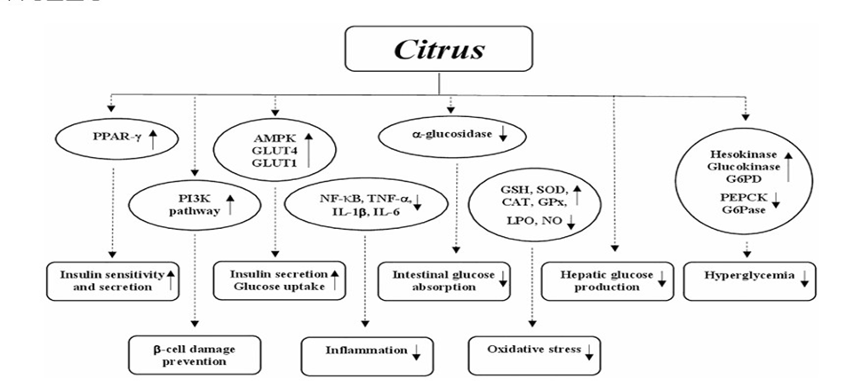 Figure No.8 Hypoglycemic Effects Of Citrus. Ampk, 50 Adenosine Monophosphate-Activated Protein Kinase; Cat, Catalase; G6pase, Glucose 6-Phosphatase; G6pd, Glucose-6-Phosphate Dehydrogenase; Glut, Glucose Transporter; Gpx, Glutathione Peroxidase; Gsh, Reduced Glutathione; Il, Interleukin; Lpo, Lipid Peroxidation; Nf-Κb, Nuclear Factor-Kappab; No, Nitric Oxide; Pepck, Phosphoenolpyruvate Carboxykinase; Pi3k, Phosphatidylinositol 3-Kinase; Ppar-Γ, Peroxisome Proliferator Activated Receptor Gamma; Sod, Superoxide Dismutase