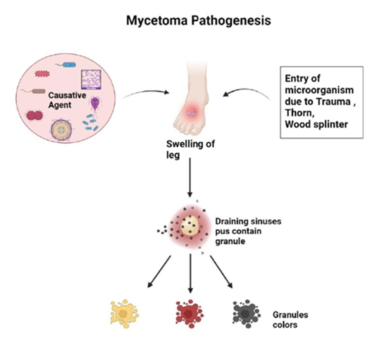 Mycetoma is a chronic, progressively destructive infectious disease of the skin and subcutaneous tissues and is recognized as a neglected tropical disease (NTD) by the World Health Organization. The condition is characterized by a classical triad of painless swelling, multiple sinus tracts, and discharge of grains containing the causative organism. Due to its slow progression and painless nature in the early stages, mycetoma is frequently diagnosed late, leading to extensive tissue destruction, disability, and in severe cases, amputation. The disease predominantly affects impoverished rural populations, where access to healthcare is limited, making effective management particularly challenging. (WHO, 2016; Zijlstra et al., 2016).