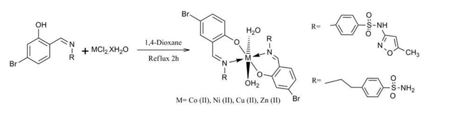 4-{[(Z)–(5-Bromo-2 hydroxyphenyl) methylidene] amino} was made by Chohan and associates. 4-(2-{[(E)–(5- Bromo-2-hydroxyphenyl) methylidene] amino}ethyl)-benzenesulphonamide SCHIFF'S bases by refluxing the ethanolic solution of sulphamethoxazole and 5-bromosalicylaldehyde for three hours while stirring continuously. Cu, Co, Ni, and Zn salts were added to a hot magnetically stirred dioxane SCHIFF'S base and refluxed for two hours. In vitro antibacterial and antifungal activity were assessed for SCHIFF'S base ligands and metal complexes against the following bacterial and fungal strains: Candida glabrata, A. flavus, Fusarium solani, Microsporum canis, Shigella flexneri, E. coli, and P. aeruginosa. The findings showed that ligand coordination enhanced their antibacterial and antifungal activities. By lowering the polarity of the transition metal ion by coordination with ligands, the chelation/coordination process makes the metal more lipophilic. The metal's ability to penetrate the lipoid layer of the microorganism's cell membrane was aided by its lipophilic nature. The Brine shrimp bioassay was used to assess the cytotoxicity of the SCHIFF'S base ligands and metal complexes. The results indicated that all of the complexes were more active, with the Zn complexes of 4-(2-[(E)–(5- Bromo-2-hydroxyphenyl)methylidene]aminoethyl)-benzenesulphonamide demonstrating exceptional cytotoxic activity against Artemia salina.[7]