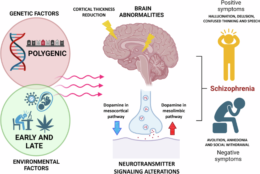 Environmental factors significantly contribute to the risk of developing schizophrenia, particularly when they interact with underlying genetic susceptibility. Adverse events during prenatal and perinatal periods, such as maternal infections, malnutrition, exposure to toxins, or complications during birth, have been linked to an increased likelihood of the disorder later in life. These early insults may disrupt normal brain development, thereby increasing vulnerability. Additionally, psychosocial stressors, including childhood trauma, abuse, neglect, and exposure to chronic stress, have been associated with a higher risk of schizophrenia.