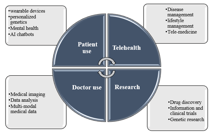 AI in healthcare enhances diagnostics, personalizes treatment, and predicts outcomes. It improves medical imaging accuracy, identifies disease patterns, and supports precision medicine through comprehensive data analysis. AI-powered virtual assistants facilitate telemedicine, while machine learning models streamline hospital operations and administrative tasks (10). In drug discovery, AI accelerates research by predicting molecular interactions. AI ensures data privacy through encryption, anonymization, and secure access controls. Additionally, AI-driven robots assist in surgeries, enhancing precision and safety. Overall, AI transforms healthcare by improving efficiency, accuracy, and patient care while addressing privacy and security challenges (2,11).