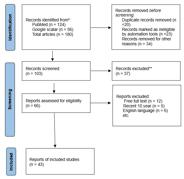 The initial search produced 180 articles from all databases. After removing 20 duplicates, we screened the abstracts and titles, eliminating an additional 103 articles. A full-text review of the 66 remaining articles resulted in 23 exclusions that didn't meet the inclusion criteria. This left us with 43 articles for the final review.