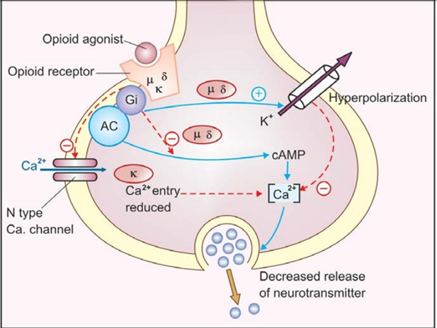All 3 types of opioid receptors (µ, κ, δ) have been cloned; all are GPCRs located mostly on prejunctional neurones. They generally exercise inhibitory modulation by decreasing release of the junctional transmitter. As such, various monoaminergic (NA, DA, 5-HT), GABA, glutamate (NMDA/AMPA) pathways are intricately involved in opioid actions. Opioid receptor activation reduces intracellular cAMP formation and opens K+ channels (mainly through µ and δ receptors) or suppresses voltage gated N type Ca2+ channels (mainly κ receptor). These actions result in neuronal hyperpolarization and reduced availability of intracellular Ca2+→decreased neurotransmitter release by cerebral, spinal, and myenteric neurones (e.g. glutamate from primary nociceptive afferents). However, other mechanisms and second messengers may also be involved, particularly in the long term.[1]