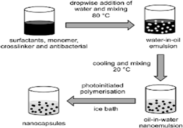 Nanocapsules can be prepared using this method by forming a water-in-oil (W/O) emulsion, where the aqueous core may contain hydrophilic biomolecules such as oligonucleotides, and the polymer (e.g., isobutyl cyanoacrylate) is present in the organic phase. Following polymer formation at the interface, the resulting nanocapsules are purified by ultracentrifugation and re-dispersed in water to obtain a stable suspension of aqueous-core nanocapsules.