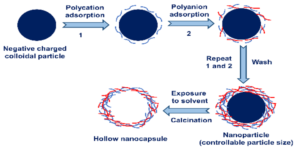 The formation of nanocapsules in this method is driven by strong electrostatic interactions between oppositely charged polyelectrolytes. At sufficiently high polyelectrolyte concentrations, irreversible adsorption occurs on the particle surface, leading to the sequential build-up of polymer layers. The process requires a colloidal template onto which a polymer layer is deposited either by immersing the template in a polymer solution followed by washing, or by reducing polymer solubility through the gradual addition of a miscible solvent.