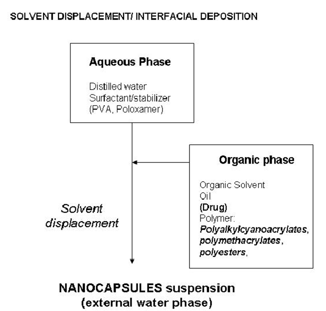 When a small quantity of a non-toxic oil is incorporated into the organic phase, nanocapsules with an oil-filled core are formed. These oil-based central cavities significantly enhance drug loading, making the method particularly suitable for lipophilic drugs. Due to the miscibility of the organic solvent with water, this technique is less effective for the encapsulation of hydrophilic or water-soluble drugs.