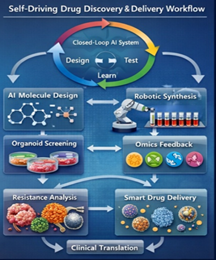 A critical and underexplored dimension of this paradigm is the integration of next-generation drug delivery systems (DDS) within the self-driving loop. Nanomedicine platforms, lipid nanoparticles, polymeric carriers, stimuli-responsive systems, and biomimetic vesicles have transformed the delivery landscape by enabling targeted, controlled, and tissue-specific transport of therapeutics. These delivery technologies are no longer limited to improving pharmacokinetics; they increasingly shape therapeutic mechanisms, immune interactions, and resistance evolution. Yet, delivery design is rarely optimized in parallel with molecular discovery. The next frontier therefore lies in combining AI-driven discovery with delivery-aware formulation engineering, creating autonomous pipelines that generate not only potent drug candidates but also clinically viable delivery solutions.