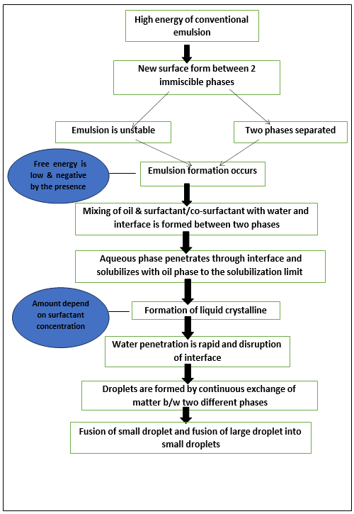 The ability of a mixture of oil, surfactant, and co-surfactant to spontaneously form fine oil-in- water emulsions when diluted with GI fluids is the basis for the self-emulsification mechanism. Co-surfactants improve the fluidity of the interface, whereas surfactants reduce the interfacial tension and create a flexible interfacial layer. Under mild gastric movement, this thermodynamically advantageous procedure enables the oil phase to dispersion into nano/micro droplets, maintaining the drug's solubility and improving absorption.