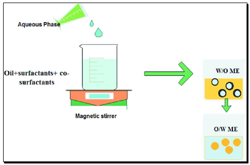 Phase Inversion Method:- Microemulsions can undergo phase inversion due to interaction with or excess of the dispersed phase [31]. This causes physical changes, like particle size alteration, affecting drug release. Phase inversion can be triggered by altering the surfactant’s curvature, often through temperature changes—shifting from O/W to W/O microemulsions at higher temperatures (PIT method) [32]. Cooling encourages formation of fine oil droplets due to low surface tension. Other factors like pH, salt content, and water volume can also influence curvature and phase behaviour [33]. Adding water gradually increases spontaneous curvature, especially with short-chain surfactants, leading to phase inversion and discontinuous microemulsions [34].