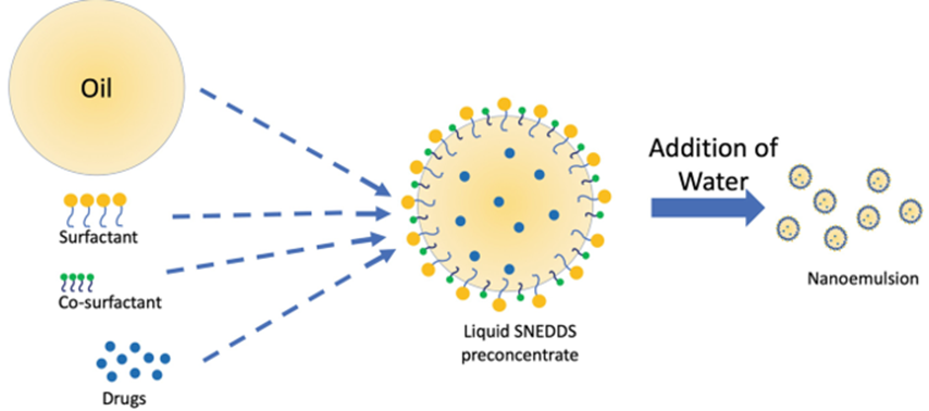 The mechanism of self-emulsification is driven by the thermodynamic and physicochemical interactions between oil, surfactant, co-surfactant, and water. The self-emulsification process involves several steps: