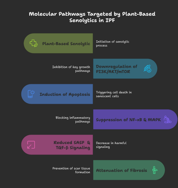Lung fibroblasts obtained from IPF patients showed decreased release of SASP proteins after being treated with plant-based senolytics drugs to preserve their cellular health [15]. Research studies prove that plant compounds engage cellular mechanisms to specifically induce death of senescent cells [15.]