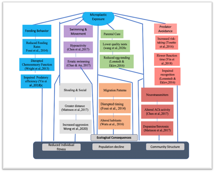 Figure 1. Schematic overview of behavioural, neurochemical, and ecological alterations induced by microplastic exposure in aquatic organisms. Microplastic exposure affects feeding behaviour, locomotion, predator avoidance, parental care, social interactions, and migration