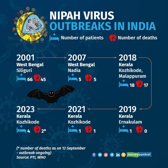 Nipah virus (NiV) is a zoonotic pathogen that has emerged as a significant public health threat in India, particularly in the state of Kerala. It is a paramyxovirus first identified during an outbreak in Malaysia in 1998. In India, NiV outbreaks have been documented since 2001, with the state of Kerala experiencing recurrent episodes since 2018. The natural reservoir of the Nipah virus is fruit bats of the Pteropus genus. These bats are widely distributed across South and Southeast Asia and are often in close contact with human settlements. The virus is transmitted to humans through direct contact with bat secretions, consumption of fruits contaminated by bat saliva or urine, and, less commonly, through contact with infected animals such as pigs. Human-to-human transmission is also well-documented, making NiV a potential candidate for epidemics. The Kozhikode, Kerala had the most severe impact of Nipah virus outbreak in 2018. It resulted approximately in 18 confirmed cases, of which 17 were fatal, underscoring the virus’s high mortality rate. The government’s response included isolating patients, intensive contact tracing, and quarantining hundreds of individuals who had come into contact with infected persons. Subsequent outbreaks in Kerala in 2019, 2021, and 2023 further emphasized the virus’s persistent threat. For instance, the 2023 outbreak in Kozhikode resulted in six laboratory-confirmed cases and two fatalities, with extensive efforts made to contain the virus by identifying and monitoring over 350 contacts. Nipah virus infection presents with a range of symptoms, from fever, headaches, and respiratory distress to severe encephalitis. In many cases, patients progress to a coma within 24 to 48 hours of symptom onset. Currently, no specific treatments or vaccines exist for NiV, making supportive care the primary management strategy. Antiviral medications such as ribavirin have been used experimentally, but their efficacy remains unproven. Kerala’s proactive approach to managing Nipah outbreaks involves robust surveillance, rapid testing, and public awareness campaigns. However, the challenges persist, especially in managing the economic and psychological impacts of recurrent outbreaks. Efforts are ongoing to develop vaccines and improve diagnostic capabilities to address this critical public health issue. [1 ,2 ,3 ,4]