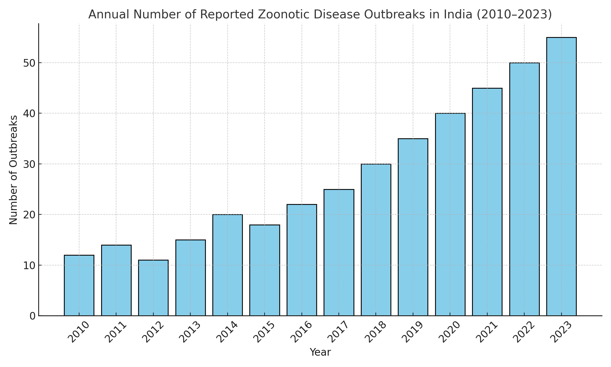 Figure 2: Bar chart image showing increasing trends in zoonotic disease outbreaks in India (2010–2023)