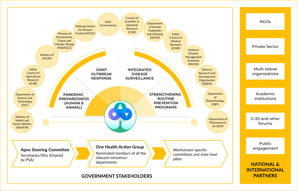 India faces significant challenges with antimicrobial resistance (AMR) and zoonotic diseases due to its vast population, diverse ecosystems, and high burden of infectious diseases. In response, the Indian government has implemented several national initiatives to address these pressing issues. [62]