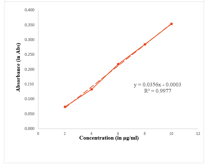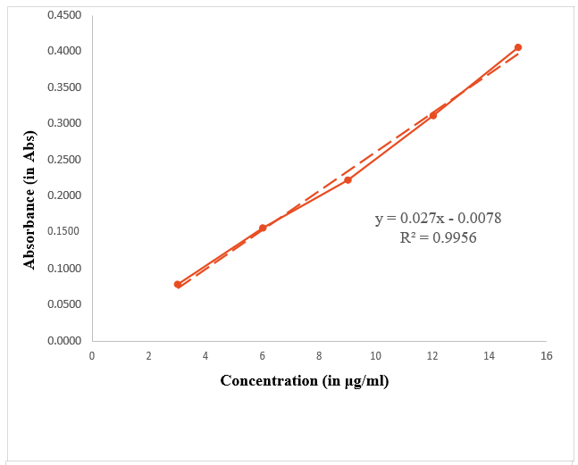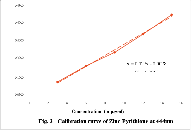LOD and LOQ were calculated based on the standard deviation of the response and the slope of calibration graph. To calculate it calibration curve for Zinc Pyrithione and Fluconazole was plotted at their λmax. Using this data regression analysis was performed using the data analysis function in Microsoft EXCEL 2017, to get the values of Residual standard deviation of Regression line and slope of the regression line. LOD and LOQ was calculated using the following formula-