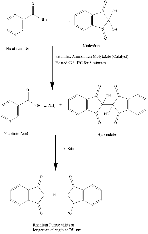Scheme: Reaction between Nicotinamide with Ninhydrin catalyzed by ammonium molybdate.